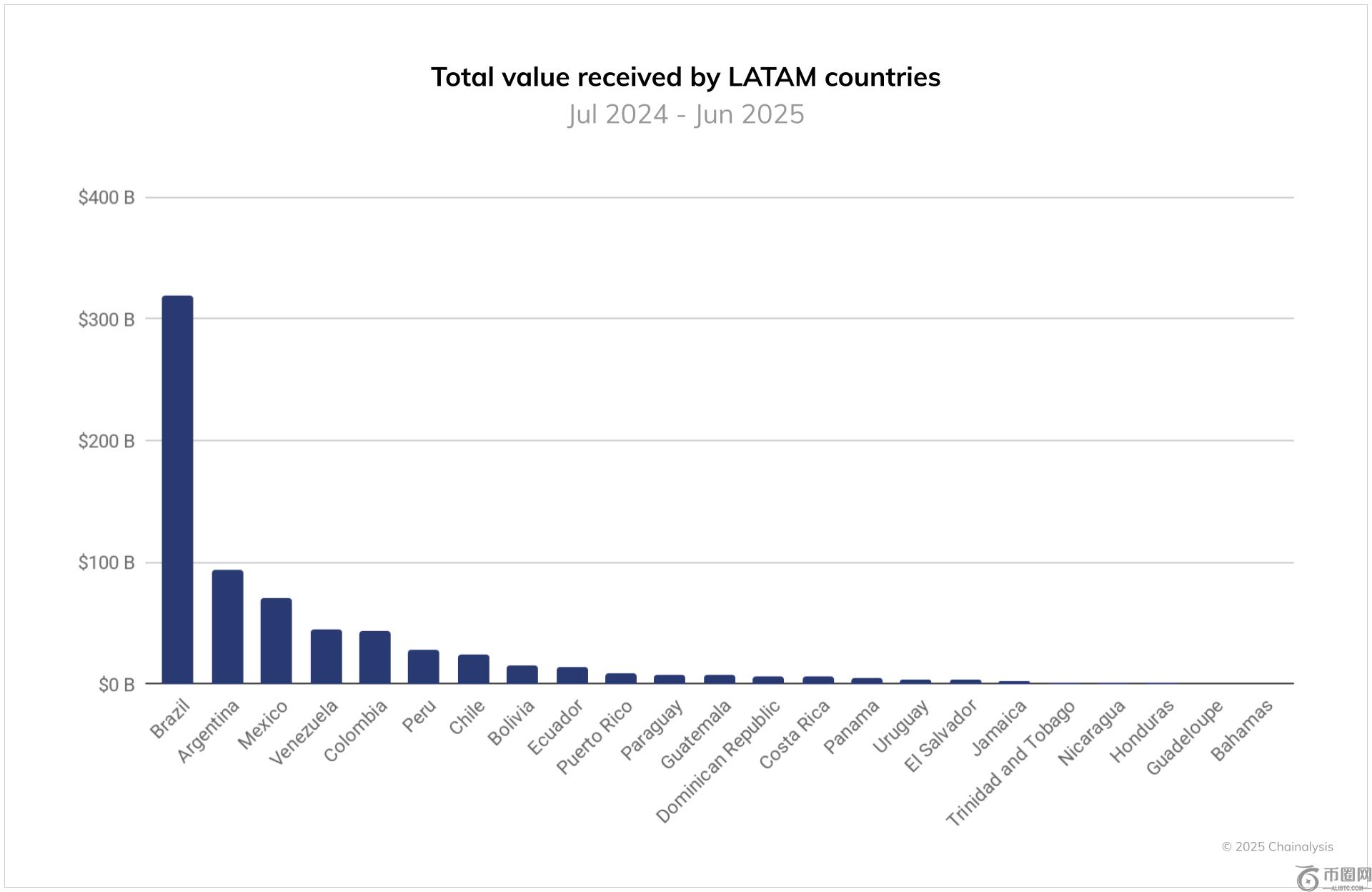 巴西在该地区处于**地位3188亿美元接收加密货币价值,占该地区加密货币流量的近三分之一。阿根廷紧随其后939亿美元,墨西哥与712亿美元、委内瑞拉446亿美元以及哥伦比亚442亿美元。 作为我们在 CNF 上报道过秘鲁、智利和玻利维亚等较小市场也录得出口量,而萨尔瓦多的出口量约为35亿美元尽管其对比特币的政策引人注目。