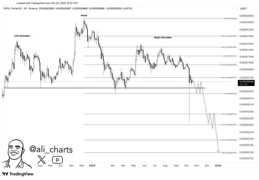 据分析师阿里·马丁内斯 (Ali Martinez) 称,PEPE出现在其两日图上形成经典的头肩形态,这种结构通常被视为趋势反转的先兆。该形态由三个峰值组成:左肩、头部和右肩,共同暗示看涨势头正在减弱。该形态的“颈线”位于 0.00000055 美元至 0.00000060 美元之间,是价格的关键支撑位。