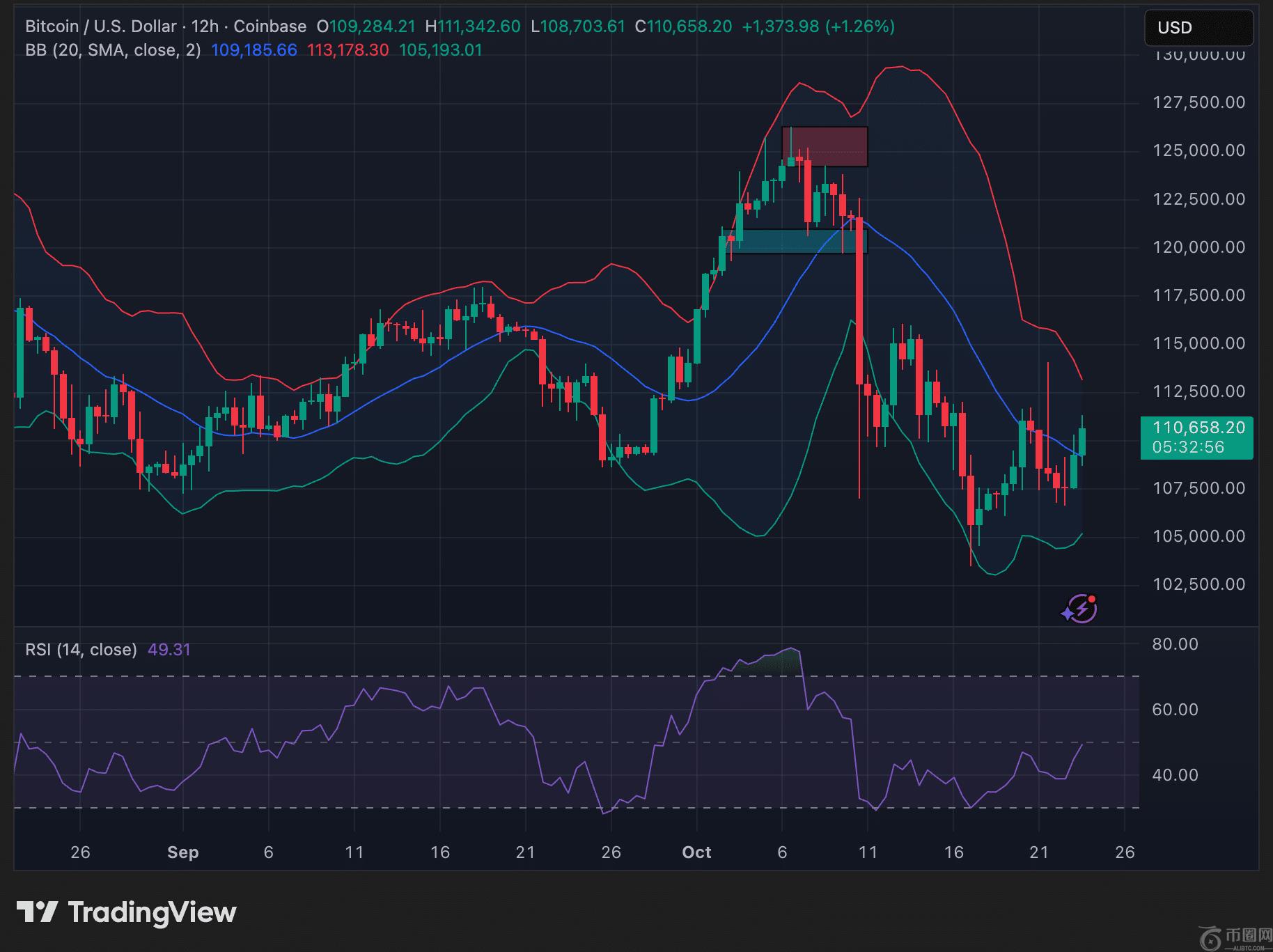 技术指标也显示出了克制的迹象。在 TradingView 的 12 小时图上,比特币交易价格约为 110,658 美元,布林带收紧,RSI 位于中性 50 附近。