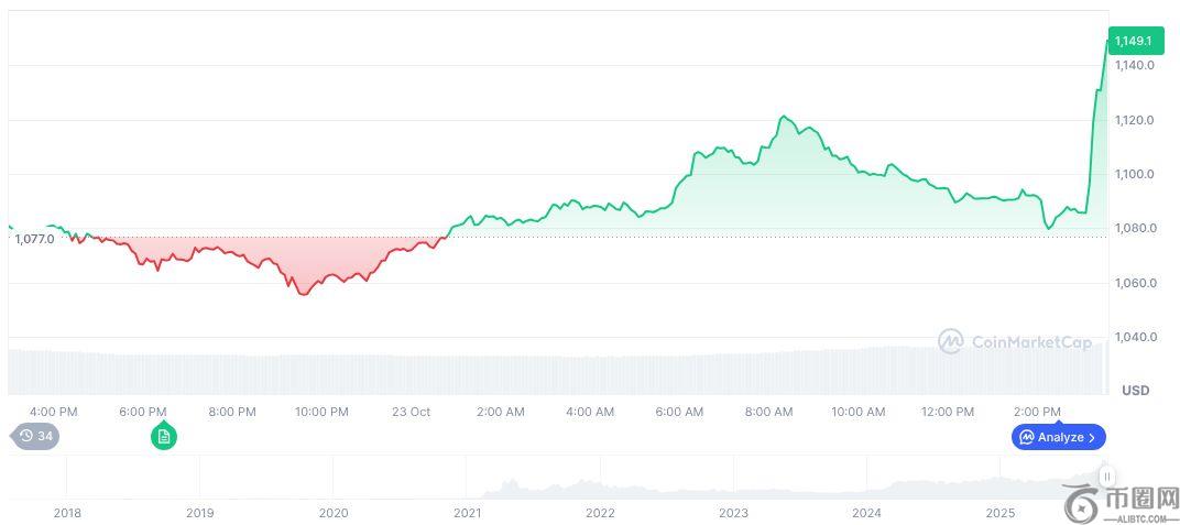 BNB 的价格为 1,118.42 美元,目前市值为 1,556.6 亿美元,占比 4.20%。据CoinMarketCap,BNB 价格在过去 24 小时内上涨了 4.50%,并在 90 天内显著上涨了 44.39%。