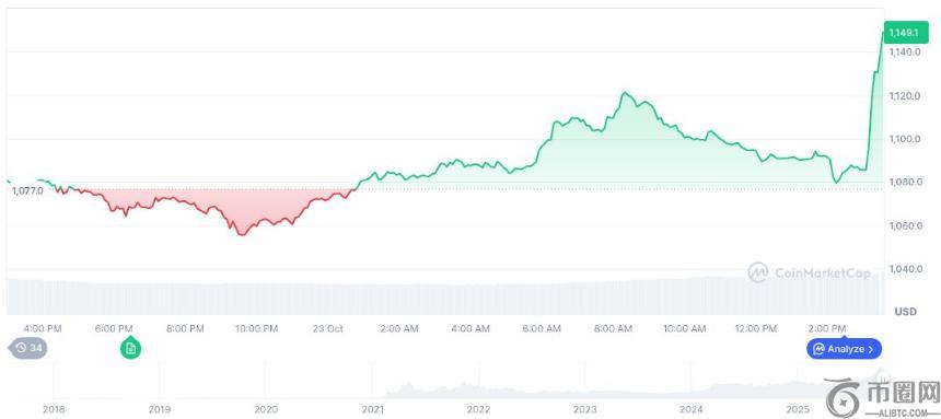 截至目前,BNB 的价格为 1,118.42 美元,市值达到 1,556.6 亿美元,占比全球加密货币市场总值的 4.20%。据CoinMarketCap数据,BNB 在过去 24 小时内上涨了 4.50%,并在 90 天内显著上涨了 44.39%。