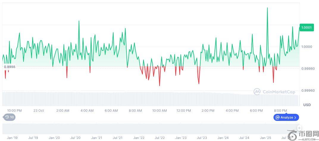 USDC(USDC),日线图,CoinMarketCap 截图,2025 年 10 月 23 日 21:30 UTC。