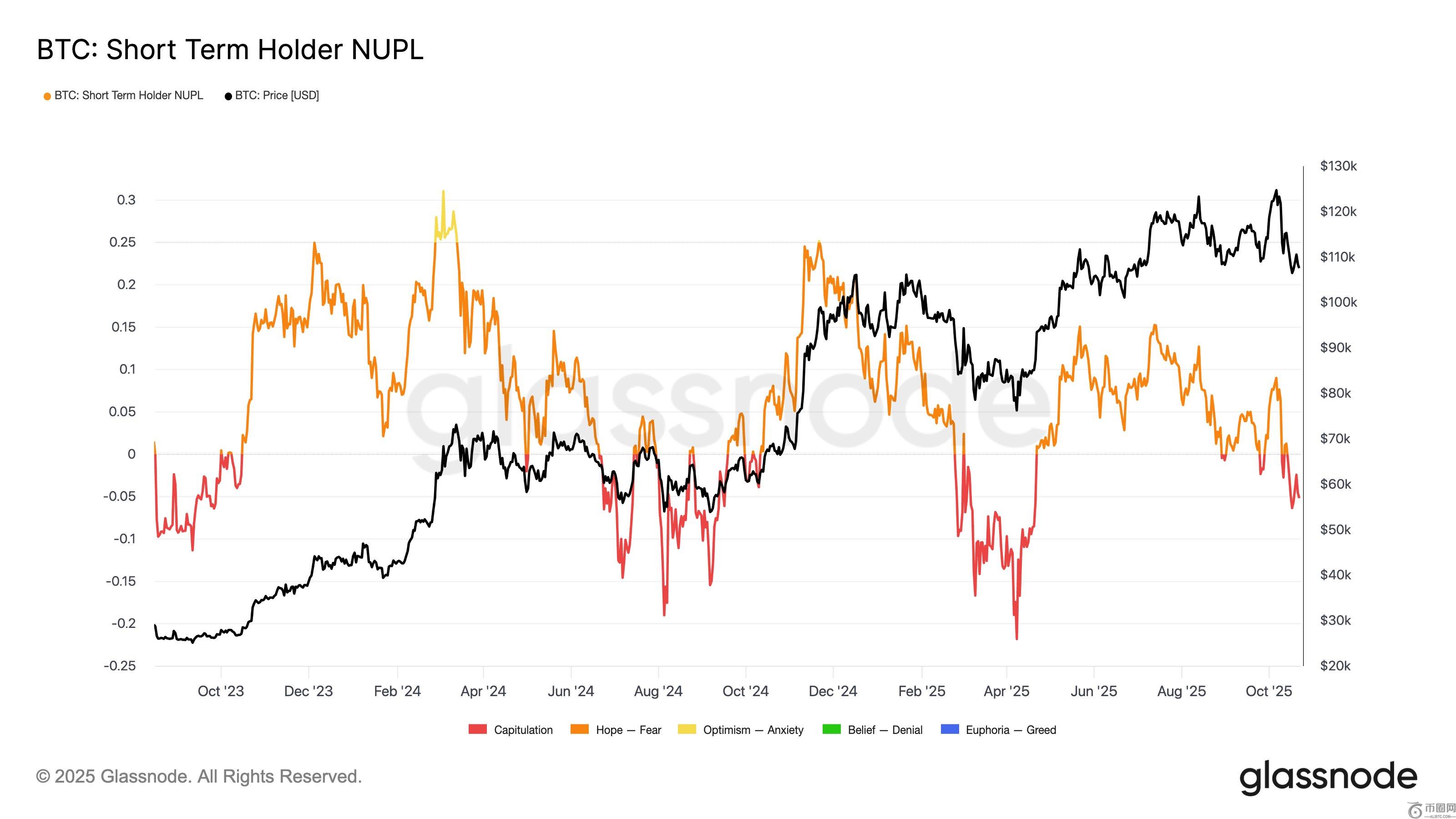 0.95 分位数并不是比特币在近期下跌过程中**跌破的水平;其价格也跌破了平均成本基础的短期持有者(STH)位于 113,100 美元。这里的 STH 指的是过去 155 天内购买 BTC 的投资者。