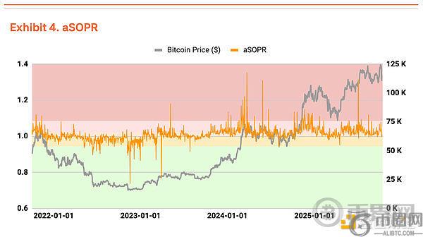 净未实现盈亏比 (NUPL) 也显示出过热区域,但较第二季度的高未实现利润状况已有所缓和(图表3)。调整后的支出产出利润率 (aSOPR) 反映了投资者的已实现盈亏,该比率非常接近均衡值1.03,表明无需担忧(图表4)。