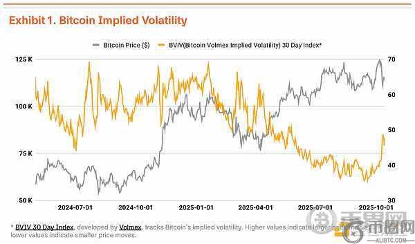 10月6日,比特币创下126,210美元的历史新高,但特朗普政府再次对**施加贸易压力,导致比特币价格回调 18%至104,000 美元,波动性显著增强。根据Volmex Finance的比特币波动率指数(BVIV),随着机构投资者稳步增持,比特币波动率从3月到9月有所收窄,但在9月之后飙升41%,加剧了市场的不确定性(图表1)。