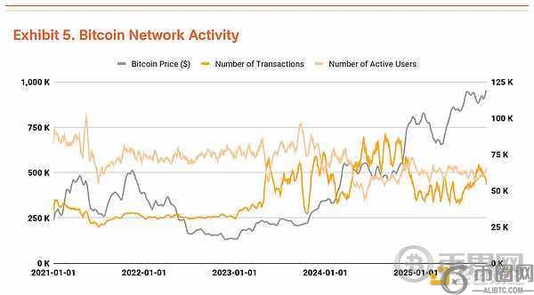 比特币的交易笔数和活跃用户数与上一季度保持相似水平,表明网络增长势头暂时放缓(图表5)。与此同时,总交易量呈上升趋势。交易笔数减少但交易量增加意味着在更少的交易中转移了更大的资金,这表明大规模资金流动有所增加。