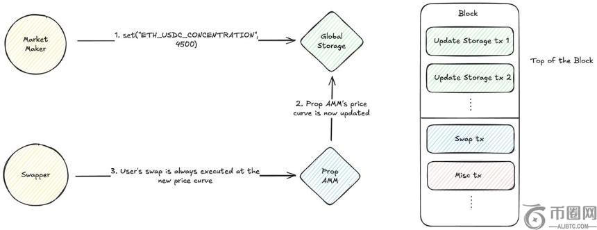要使 Prop AMM 在 EVM 上可行,关键在于解决更新成本和优先执行的问题。Uniswap 团队提出了一种新方法:全球存储智能合约 专门的区块构建器策略。