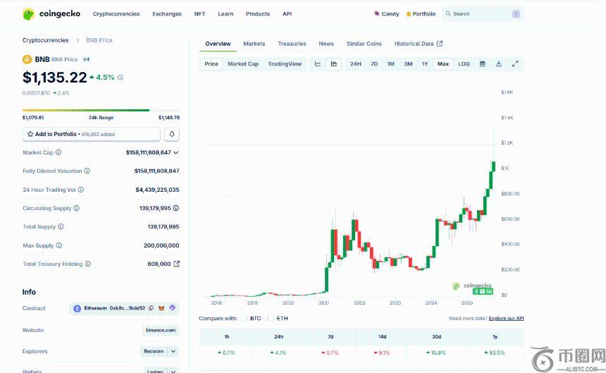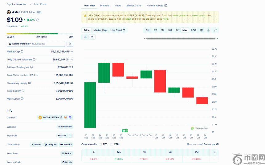 消息公布后,BNB USDT和ASTER USDT价格出现小幅上涨。根据科因杰科数据显示,BNB加密货币交易价格突破1,100美元,24小时内涨幅达4.1%,过去一个月涨幅超过11%。同时,BNB USDT也成功收复了上周的跌幅。