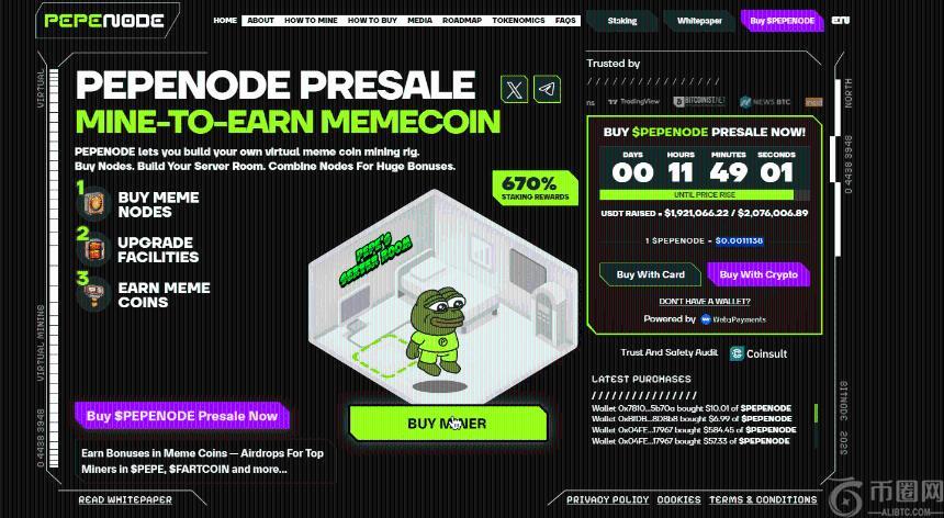截至目前,PepeNode预售已筹集超过190万美元,其**价格为0.0011138美元,预计未来12小时内将继续上涨。此外,预售投资者持有PEPENODE可获得高达 670%的年化收益。