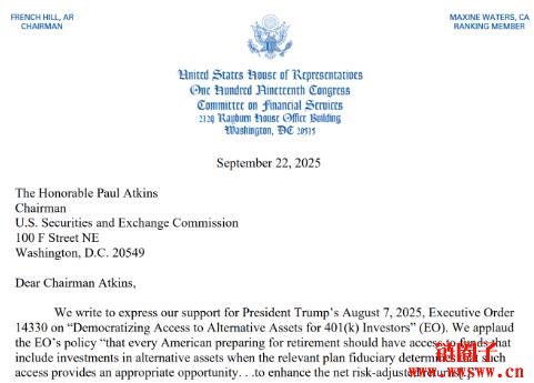 随后在9/22,9 位共和**会议员联名致函SEC 主席Paul Atkins,要求尽速协助劳工部,并对现行法规和指引做必要的调整。联名议员包括,众议院金融服务委员会主席French Hill,资本市场小组委员会主席Ann Wagner 等。