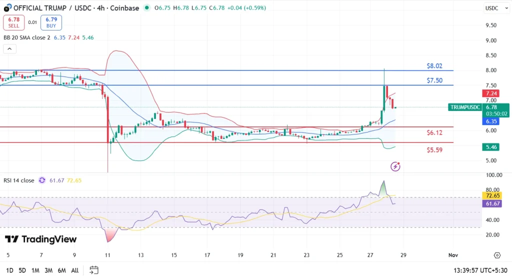 官方特朗普币的**性上涨撼动了加密货币排行榜,价格一度飙升至 8.02 美元,随后稳定在 6.77 美元附近。作为一名交易员,看到单日如此剧烈的波动既令人兴奋,又富有启发性。特朗普币价格一周内已上涨超过 15%,打破了行业**的局面,也让所有关注图表的人都关注其技术突破水平。