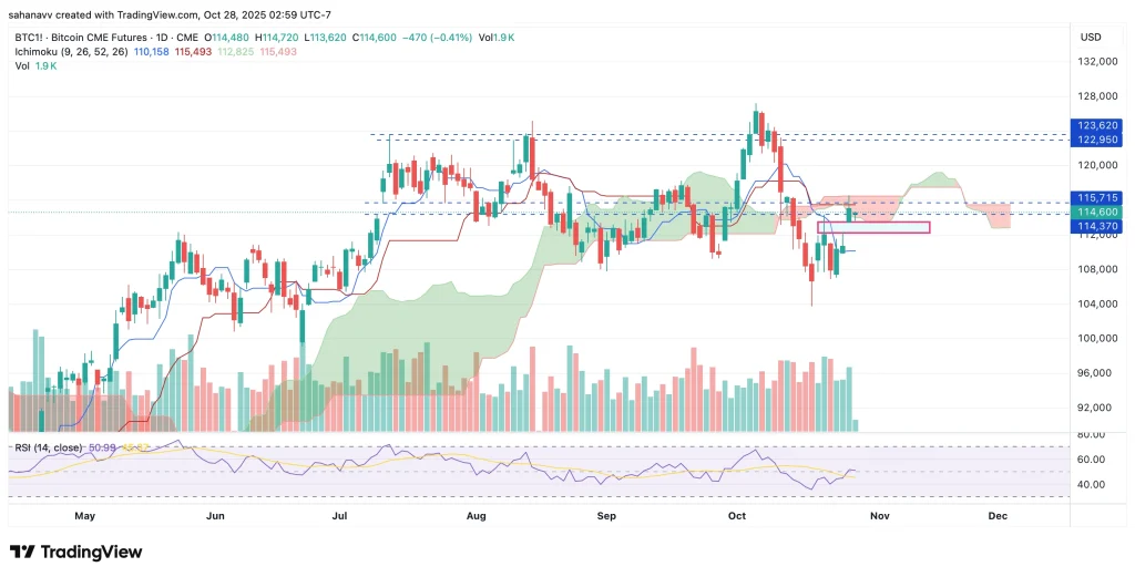 比特币从 107,800 美元的低点反弹,价格已升至 114,600 美元,但目前该走势遭遇了 110,700 美元至 113,500 美元之间的关键 CME 缺口,如图所示。这一未填补的缺口已成为交易员关注的焦点,因为比特币在形成持续趋势之前经常会重新回到这些水平。一目均衡表目前充当动态阻力位,其上边界位于 115,700 美元附近,与缺口顶部重合。