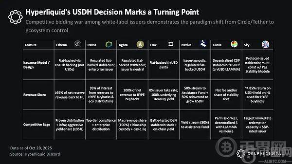 在 USDH 的竞标过程中,几乎所有主要的白标稳定币发行方都参与其中,包括 Native Markets、Paxos、Frax、Agora、MakerDAO(Sky)、Curve Finance 以及 Ethena Labs。这是稳定币经济在应用层的**大规模竞争,标志着“分发权”的价值正被重新定义。