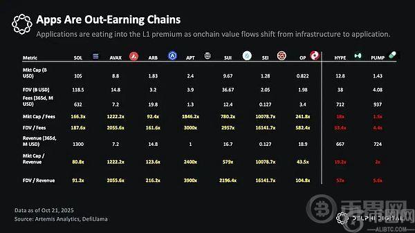 这是一场正在进行的权力转移。应用层的估值正日益取决于它们创造并返还给生态系统的真实收入,而公链层仍在艰难地寻找自身估值的合理性。不断削弱的 L1 溢价,正是最清晰的信号。