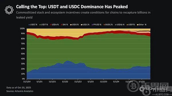 Tether 与 Circle 的护城河正在被侵蚀:分发渠道胜过网络效应。Tether 和 Circle 所占据的稳定币市场份额,可能已经在相对意义上触顶——即便稳定币的总体供应量仍在持续增长。预计到 2027 年,稳定币的总市值将突破 1 万亿美元,但这一扩张的收益不会像上一个周期那样主要流向既有巨头。相反,越来越多的份额将流向「生态原生稳定币」与「白标发行(white label issuance)」策略,因为区块链和应用开始将收益与分发渠道「内生化」。