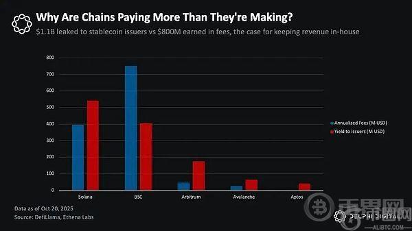 以 Solana、BSC、Arbitrum、Avalanche、Aptos 为例,Circle 与 Tether 每年获得约 11 亿美元收益,而这些生态仅赚取 8 亿美元交易费。