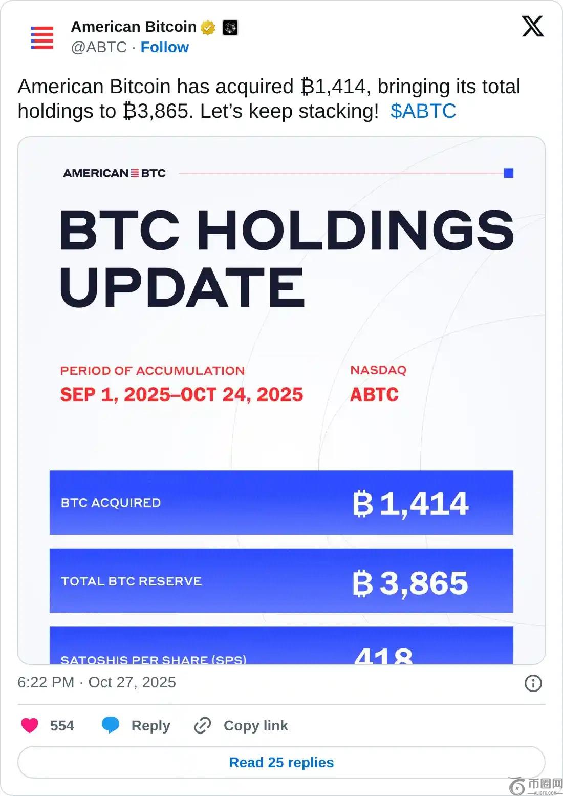 同期,美国总统唐纳德·特朗普的儿子埃里克和小唐纳德·特朗普的公司美国比特币宣布收购1,414个BTC,价值约1.63亿美元,使其总持有量达到3,865个BTC。