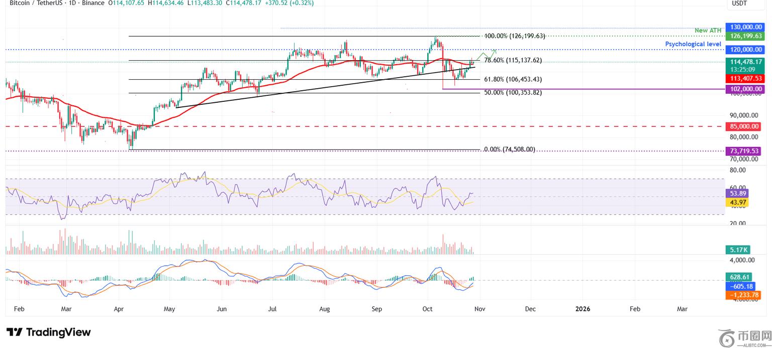 比特币价格周三,BTC 在 61.8% 斐波那契回撤位(从 4 月份低点 74,508 美元到历史高点 126,199 美元)附近获得支撑,价格位于 106,453 美元。BTC 在接下来的四天里上涨了 6.57%,收于 50 日指数移动平均线 (EMA) 上方,价格位于 113,407 美元。然而,BTC 在 78.6% 斐波那契回撤位 115,137 美元附近遭遇轻微阻力。截至周二撰写本文时,BTC 在 50 日均线 113,407 美元附近获得支撑。