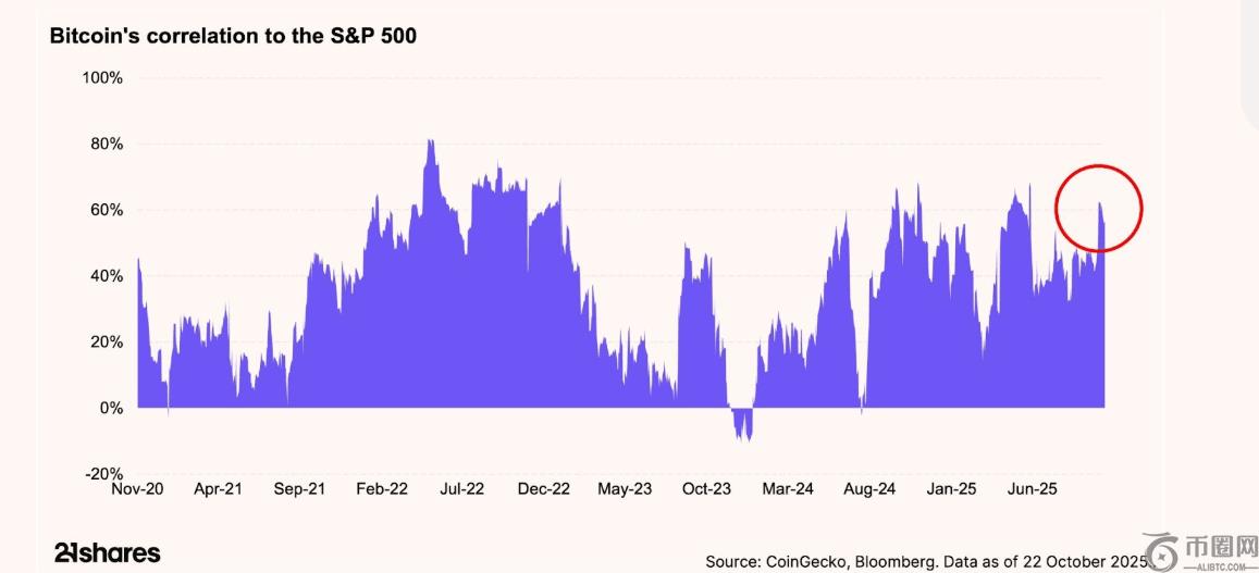 21Shares 周报指出,10 月 10 日市场崩溃是由特朗普总统提议对**进口商品征收 100% 的关税引发的,这再次引发了贸易战的担忧,并推高了比特币的价格。相关性标准普尔 500 指数上涨 60% 以上。
