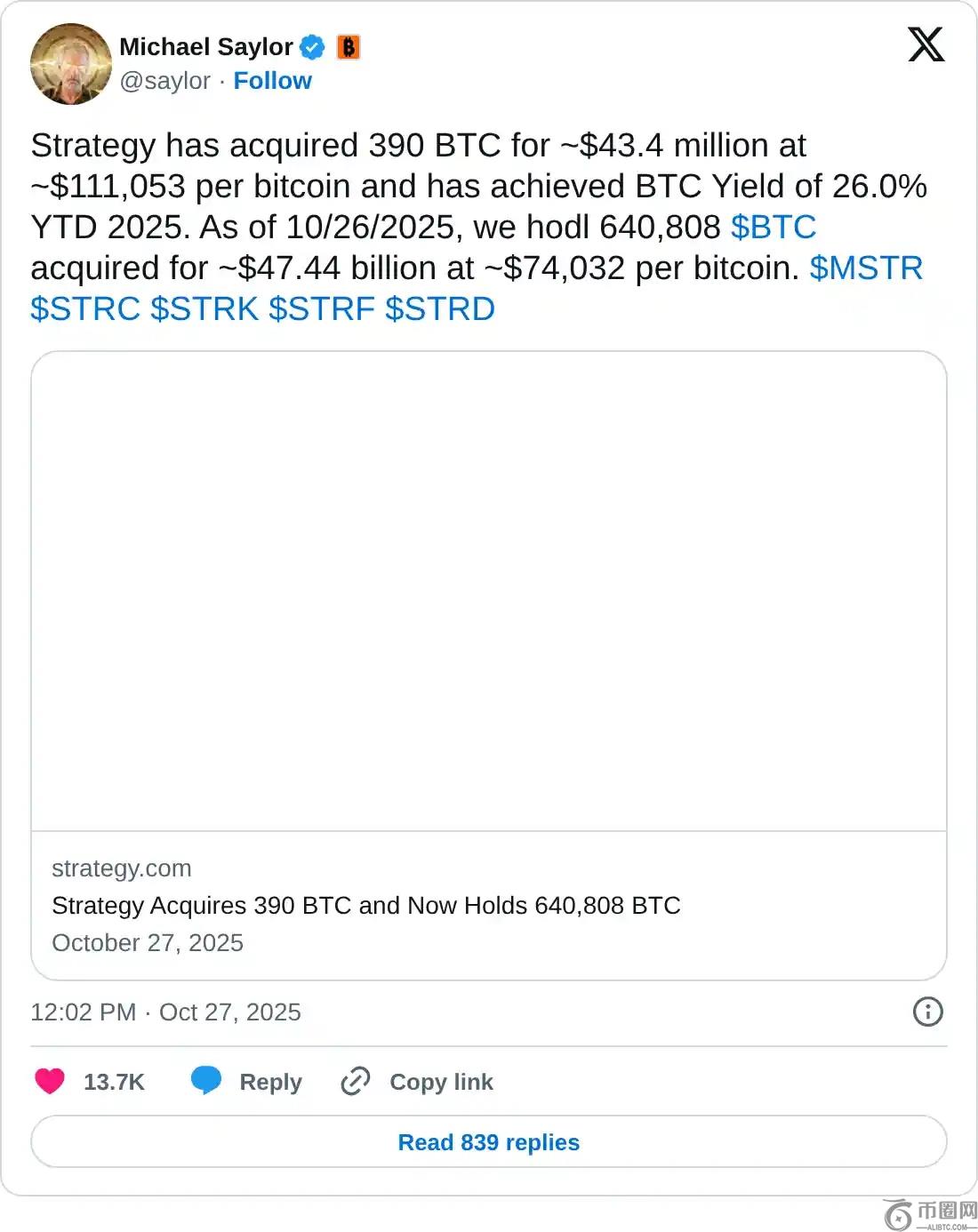 随着本周开始,机构需求增强,周一,Strategy 宣布该公司已增加 390 个 BTC,目前共持有 640,808 个 BTC 储备,价值 474.4 亿美元。