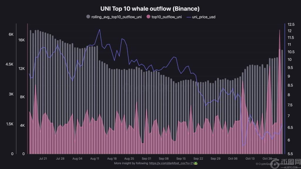 除了技术指标之外,链上指标还包括回响大型投资者重新燃起兴趣。数据显示,UNI 加密货币流出量显著激增,尤其来自鲸鱼钱包的前十大交易。该活动达到了每日 17,400 个 UNI 的峰值,以及三个月来每月 5,250 个 UNI 的**流出量,表明有影响力的持有者正在增持 UNI。
