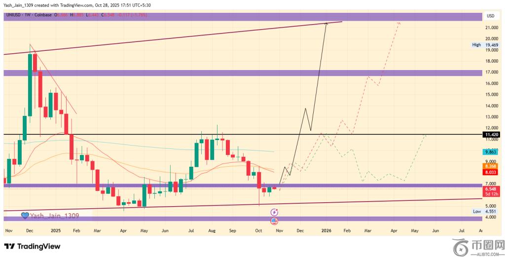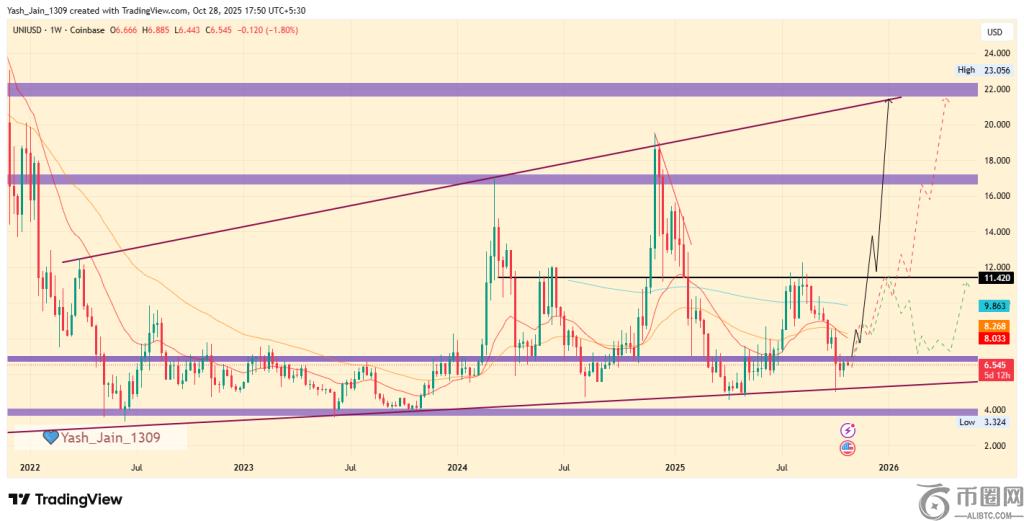 Uniswap 今日价格徘徊在 6.54 美元附近,在重新测试其多年上升扩展楔形形态的下边界后趋于稳定。自 2022 年以来,该形态一直主导着UNI/美元价格行为,在明确定义的趋势线内产生周期性的反弹和回调。