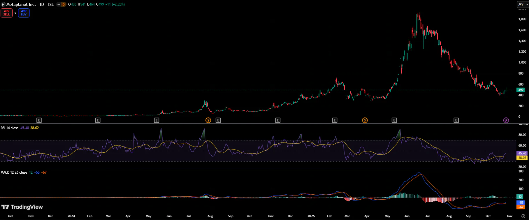 Metaplanet 股价周二攀升至 519 日元,随后出现温和的获利回吐,盘中交易价格在 464 至 541 日元之间波动。交易量激增至 7500 万股以上,远超 4900 万股的平均水平。交易量的激增凸显了市场对该公司以比特币为驱动的商业模式的信心重燃。