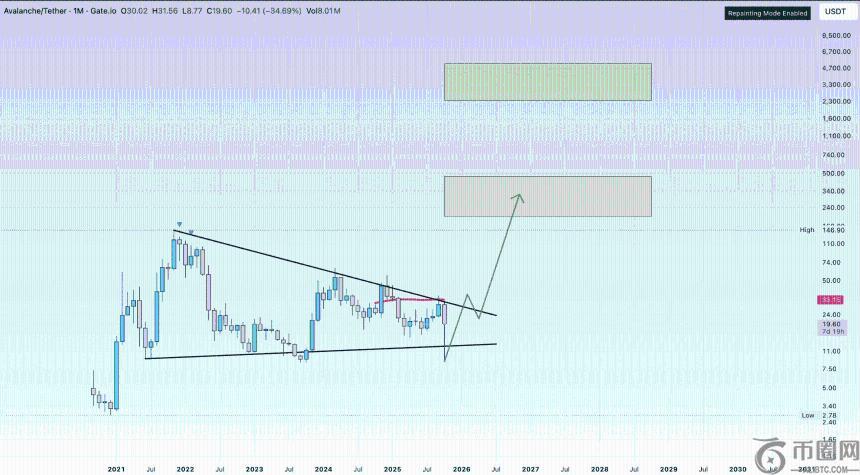 从月线图来看,AVAX 价格正在形成一个下降楔形形态,只要 11 美元的支撑位保持不变,该结构就保持稳定。当价格达到 23.5 美元左右时,AVAX 将处于突破楔形的边缘,并可能引发一轮爆发式上涨,**目标价位为 30 美元至 32 美元。