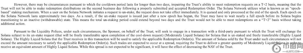 Bitwise 计划将基金中 100% 的 SOL 持仓进行质押,旨在**限度地提高约 7% 的平均质押收益。鉴于典型的“冷却期”(即赎回 SOL 的冷却期)为 48 小时或更短,Bitwise 希望以 T 2 的方式满足赎回要求。在特殊情况下,该基金的 S-1 文件第 90 页描述了将采取哪些措施: