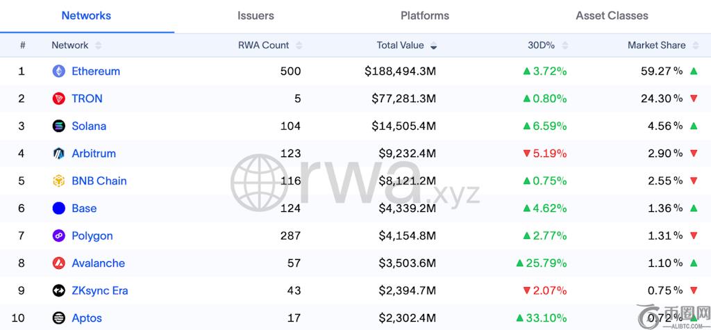 此图表来自RWA.xyz图表显示了每条链上稳定币/**化 RWA 的价值:
