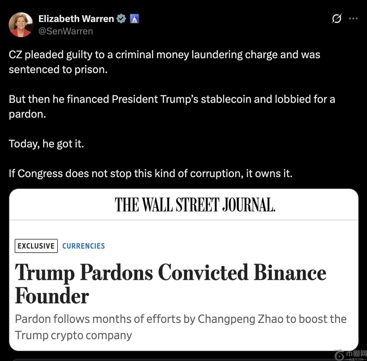 据一份报告称纽约邮报赵长鹏通过其律师 Teresa Goody Guillen 起草了一封要求信,要求沃伦撤回她在特朗普总统上周赦免创始人后就 X 发表的言论。