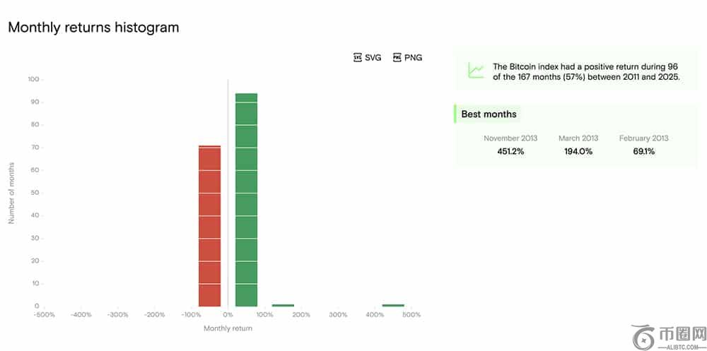 从历史数据来看,10 月份的下跌趋势并非总会延续到 11 月份。数据显示,11 月份是比特币表现**的月份,价格在一个月内上涨了 451.2%。虽然 10 月份通常也是比特币的好月份,但其“上涨幅度”通常不会超过 11 月份。