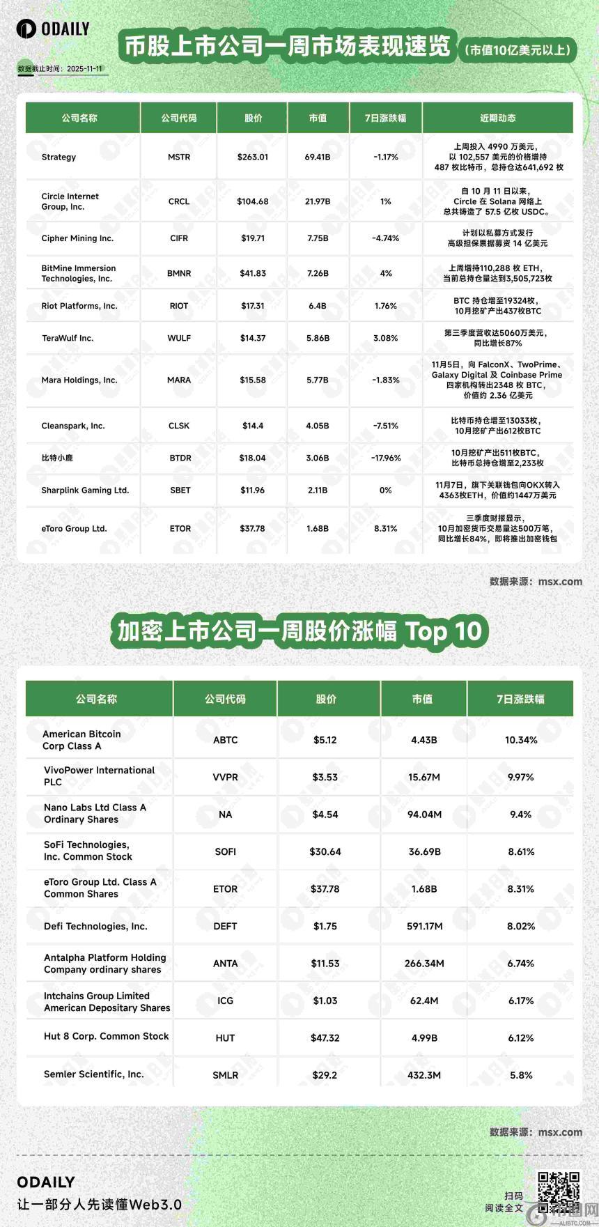 编者按:随着比特币价格一度跌破10万美元大关,加密市场在“10·11大跌”后再次陷入恐慌情绪。与此同时,隐私赛道、存储赛道等老牌项目**因名人效应、市场需求及概念带动等利好短暂迎来高光时刻,但加密货币概念股整体仍随大盘下跌进入下行趋势。然而,Coinbase、Robinhood等企业凭借预测市场和发射平台等增量业务引发市场较高预期,股价波动相对较小。后续建议投资者关注龙头企业股价走势,并结合市场行情适度止盈止损。以下为Odaily星球日报总结整理的上周币股市场信息,所有美股数据均来自msx.com。
