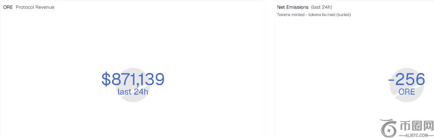 数据显示,过去 24 小时,ORE 协议日收入 87 万美元,**净供应(新铸造**-销毁**)减少了 256 枚。按照当前的协议收入,**日通缩价值约 9.7 万美元。