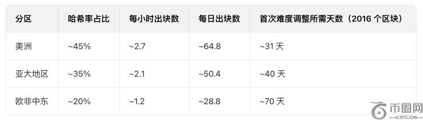 根据之前的哈希率占比估算,各分区**难度调整的时间如下: