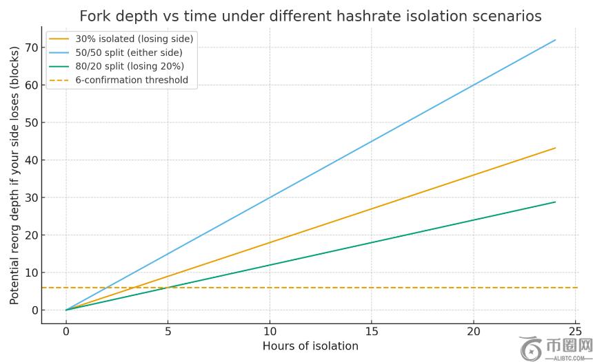 - 30% 哈希率被隔离时,少数派分区每小时约产出 1.8 个区块。这意味着该分区内标准的 6 次确认支付,在约 3 小时 20 分钟后会面临失效风险 —— 若其余 70% 的网络构建出更长链条,这 6 个区块可能被孤立。