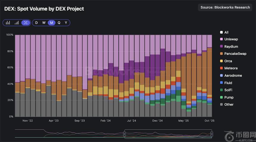 既然 Uniswap 将在**价值与协议成功之间建立清晰的价值积累机制,那么 UNI 的合理价值是多少?过去两年,Uniswap 在去**化交易所 (DEX) 领域的**地位有所下降,交易量市场份额从 2023 年 10 月的 60% 以上跌至上个月的不足 15%。DEX 市场份额的变化反映了 Solana 同期在链上交易活动中日益增长的主导地位,以及诸如其他协议的崛起。机场并且已经成功地在 Uniswap 上保持**地位根据.