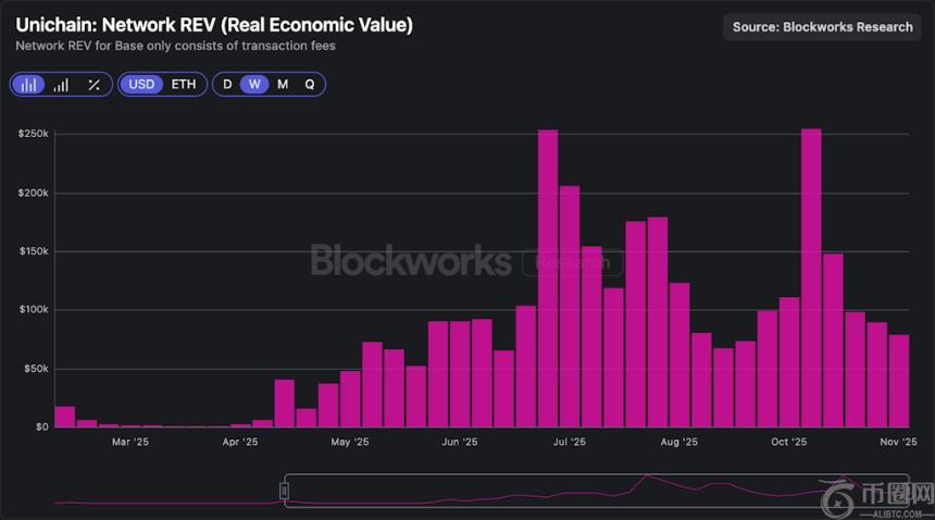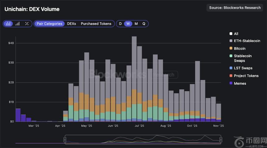以Unichain为例,其网络活跃度依然相对低迷,每周去**化交易所(DEX)的交易量自7月以来持续下降。上周的交易量为9.25亿美元,是自4月中旬以来的**水平。