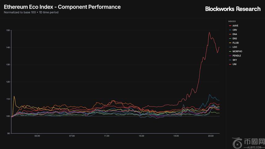 就交叉指数表现而言,周一表现最为突出的是以太坊指数和Solana生态系统指数,分别上涨了7.9%和5.2%。以太坊指数中表现**的资产是UNI,在Uniswap Labs和Uniswap基金会联合提出激活协议费用的治理提案后,UNI当日飙升了40%。