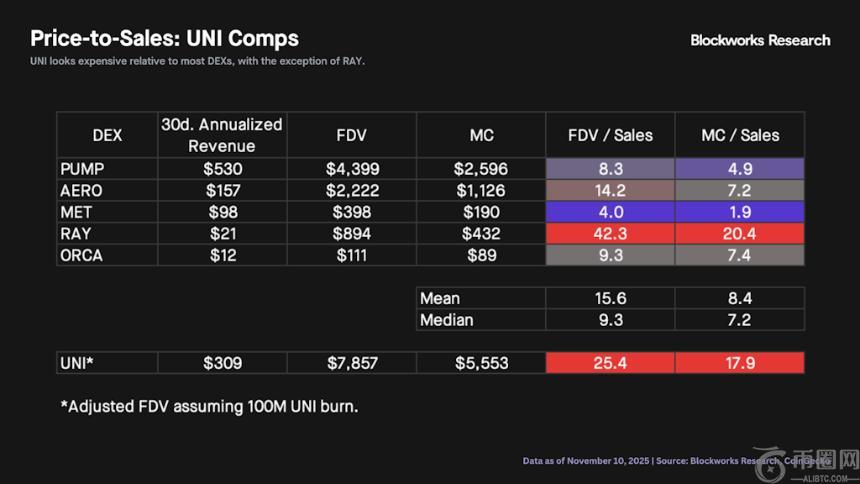 尽管 UNI 化提案是朝着正确方向迈出的一步,但即使考虑到 1 亿 UNI 的追溯性销毁,UNI 相对于该群体的中位数和平均售价比率而言仍然显得昂贵。