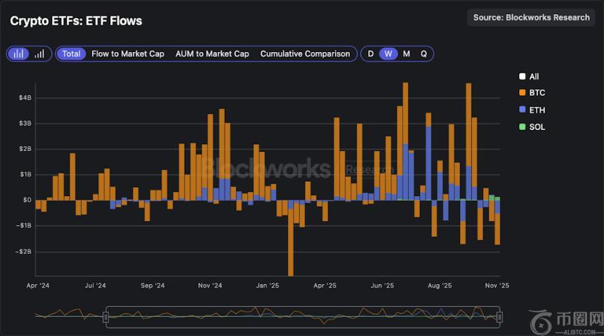 尽管黄金表现逊于比特币,但比特币在周一迎来了一丝喘息之机,此前两周ETF资金净流出总额高达20亿美元。其中近一半的资金流出来自贝莱德旗下的IBIT。本周ETF资金流动能否重拾势头,值得关注。