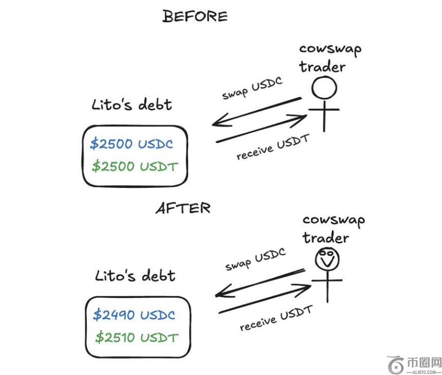 接下来,有一位交易者在 Cowswap 上想用 10 枚 USDC 兑换 USDT,而交易被路由到了 Fluid 的 USDT–USDC 债务池中。交易者会向 Fluid 的流动性层存入 USDC,并提取 USDT——交易者很满意。
