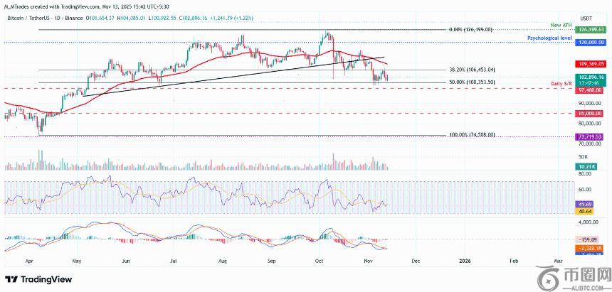 比特币价格周一小幅上涨并重新测试了 106,453 美元的关键阻力位——该阻力位是 38.2% 的斐波那契回撤位(从 4 月 7 日的低点 74,508 美元到 10 月 6 日创下的历史高点 126,299 美元,即 100,353 美元)——随后两天下跌了 4.11%。截至周四发稿时,比特币小幅反弹,交易价格高于 102,800 美元。