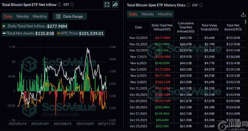 本周迄今为止,机构资金流动反映出市场情绪复杂,比特币现货 ETF 的资金流入和流出交替出现——根据 SoSoValue 的数据,周三 2.7798 亿美元的资金流出与周二 5.2398 亿美元的资金流入和周一 115 万美元的资金流入形成鲜明对比。这凸显了机构投资者的犹豫不决,因为 ETF 资金流动的波动表明他们对**的加密货币市场持谨慎态度。