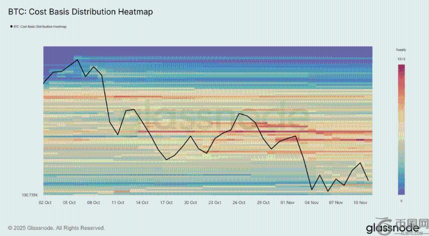 此外,成本基础分布热力图还显示,10.6 万美元至 11.8 万美元之间的密集供应区持续抑制上涨动能,因为许多投资者会利用这一区间在接近盈亏平衡点时离场。这种潜在供应过剩形成了一个天然阻力区,反弹行情可能在此停滞,这意味着持续复苏需要足够强劲的资金流入来消化这波派发。