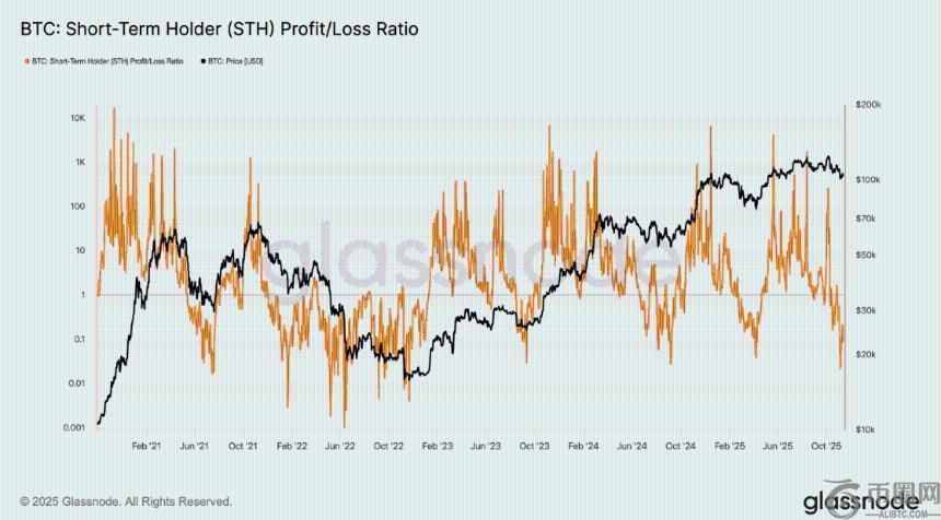 如下图所示,比特币价格一度触及 98,000 美元,STH 已实现盈亏比跌破 0.21,这意味着超过 80% 的已实现价值来自亏本出售的比特币。这种抛售的强度一度超过了本轮周期前三次重大抛售,凸显了市场头重脚轻的现状,以及 100,000 美元关口对于近期市场稳定至关重要。