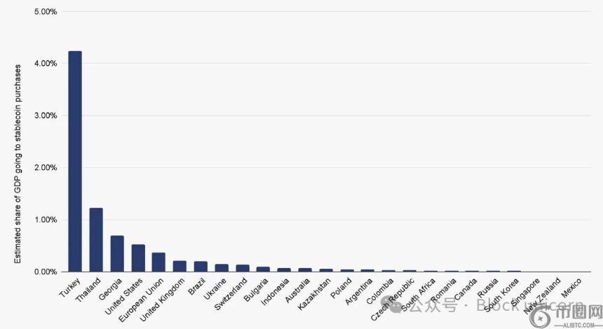 在波动性**的地区,这种趋势最为显著。在阿根廷,超过 62% 的加密货币交易涉及稳定币,而去年这一比例为 45%。在巴西,近 70% 的交易所资金流出以 USDT 或 USDC 计价,这反映出稳定币正在推动贸易、储蓄和工资发放。土耳其面临着超过 55% 的通货**率,去年稳定币交易量超过 380 亿美元,相当于其 GDP 的 4.3%,占全球**比例。