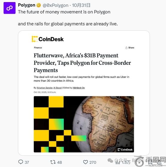 今年,非洲**的支付处理商 Flutterwave(年交易额超过 400 亿美元)选择 Polygon 作为其在 30 多个** / 地区进行跨境稳定币结算的默认区块链。此次合作是历史上规模**的稳定币实际部署之一,为 Uber 和 Audiomack 等主要客户的消费者和企业级交易流程提供支持。