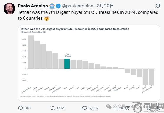 到 2024 年底,Tethe 当时已成为美国国债的第七大外国买家,在年度购买量上超过了加拿大和墨西哥等**。