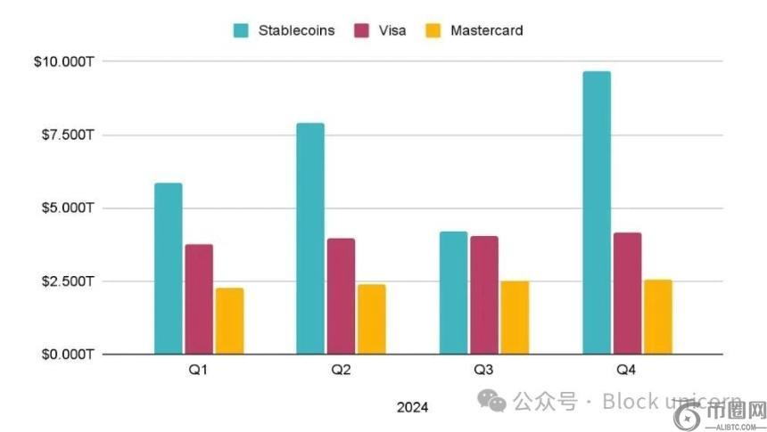 图表:2024 年季度链上稳定币转账量(蓝色)与 Visa(粉色)和 Mastercard(黄色)支付量的对比。到 2024 年第四季度,稳定币网络处理的价值已显著超过主要卡网络。
